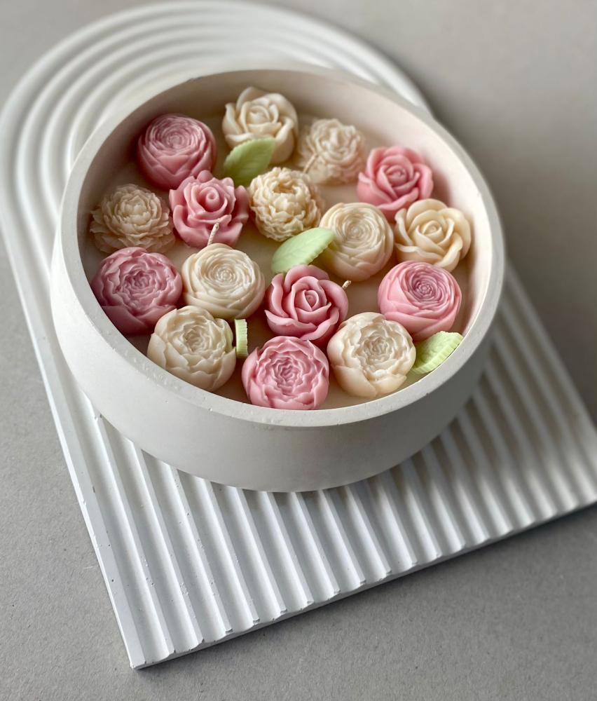 قالب كونكريت دائري مصنوع يدويا و يحتوي على شمع طبيعي و نباتي برائحة الفانيلا الهادئه و يزينه وردات شمع بألوان زاهيه